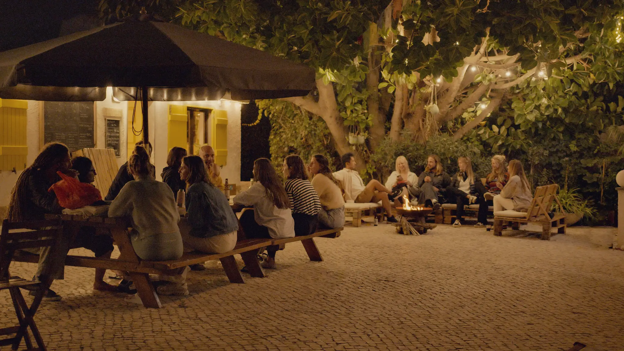 Guests relaxing in the garden of Moka Surf House during an evening gathering with firepit and warm lights under the trees.