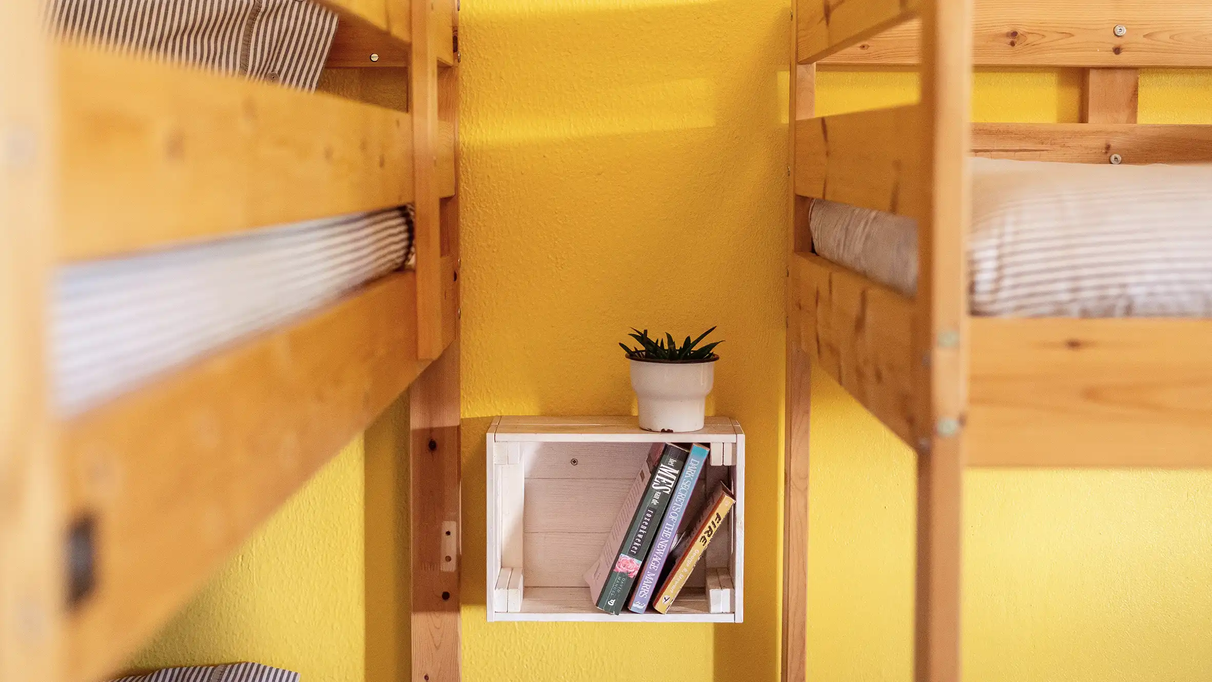 Detail of a shared room with wooden bunk beds, books, and a small plant at Moka Surf House & Yoga Retreat in Portugal.