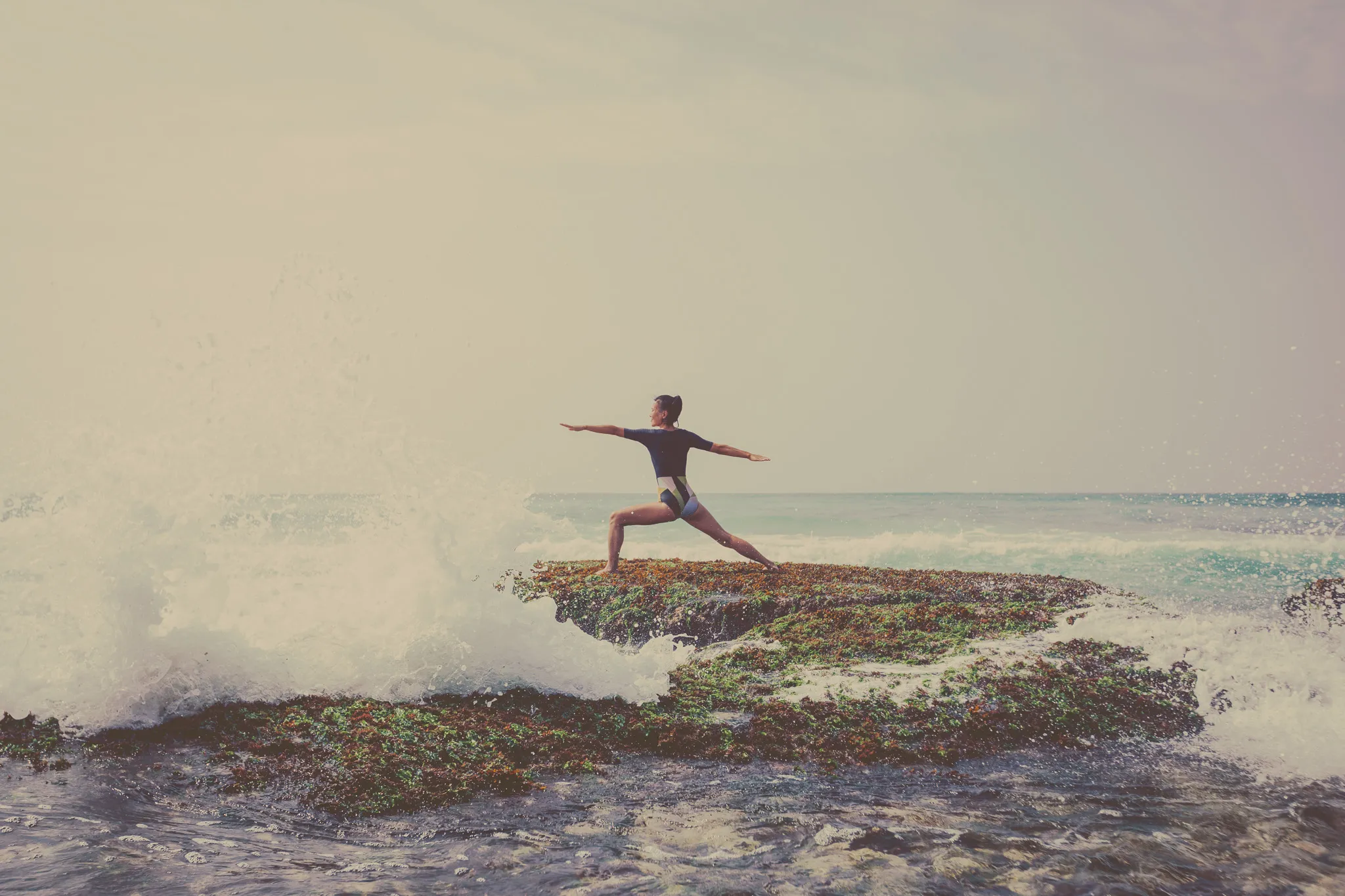 Woman in warrior pose practicing yoga on a rocky shore as ocean waves crash around her during a surf and yoga retreat in Ericeira.