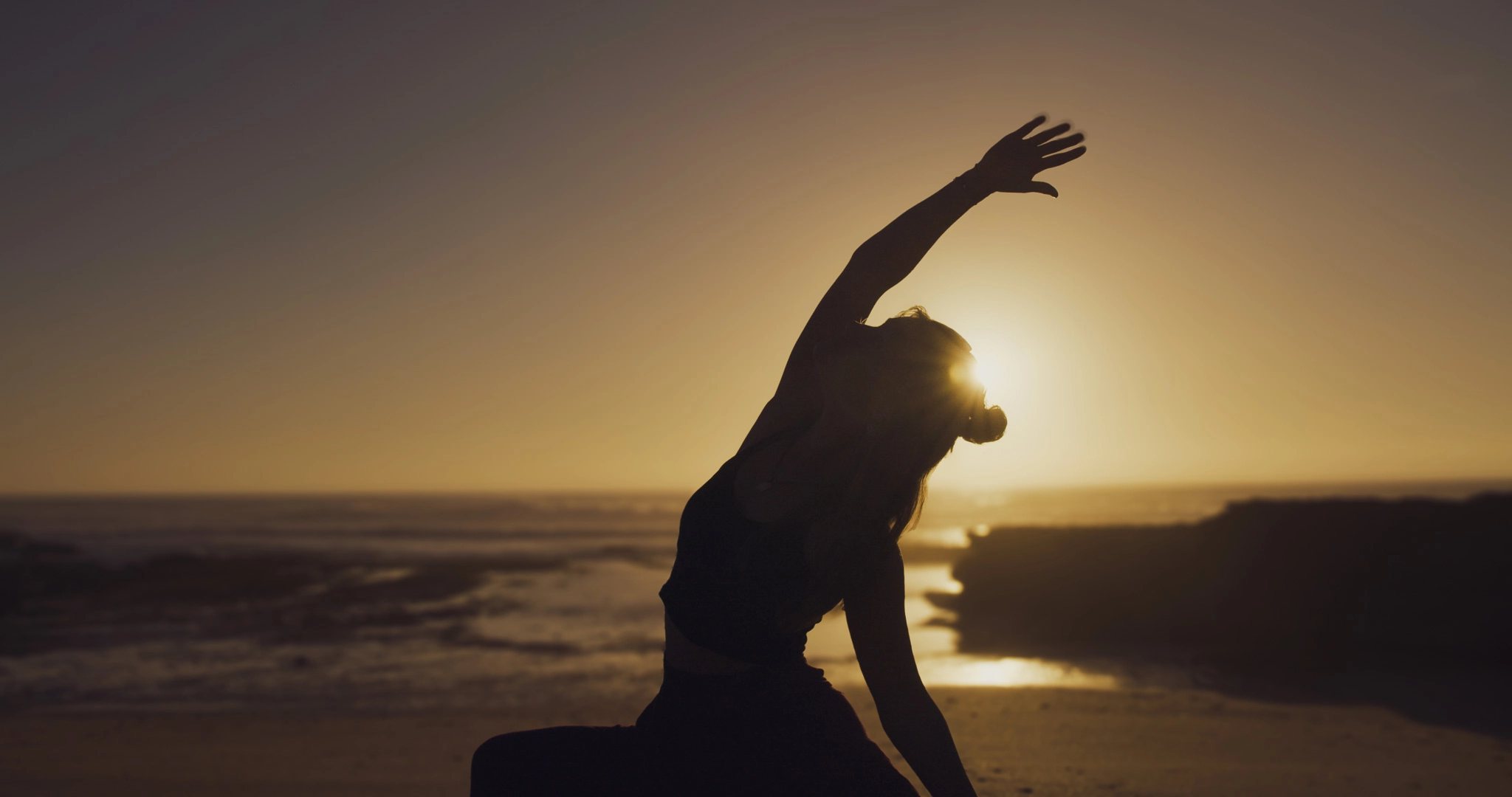 Silhouette of a woman practicing yoga at sunset on the beach in Ericeira, part of the Moka Surf House yoga experience.